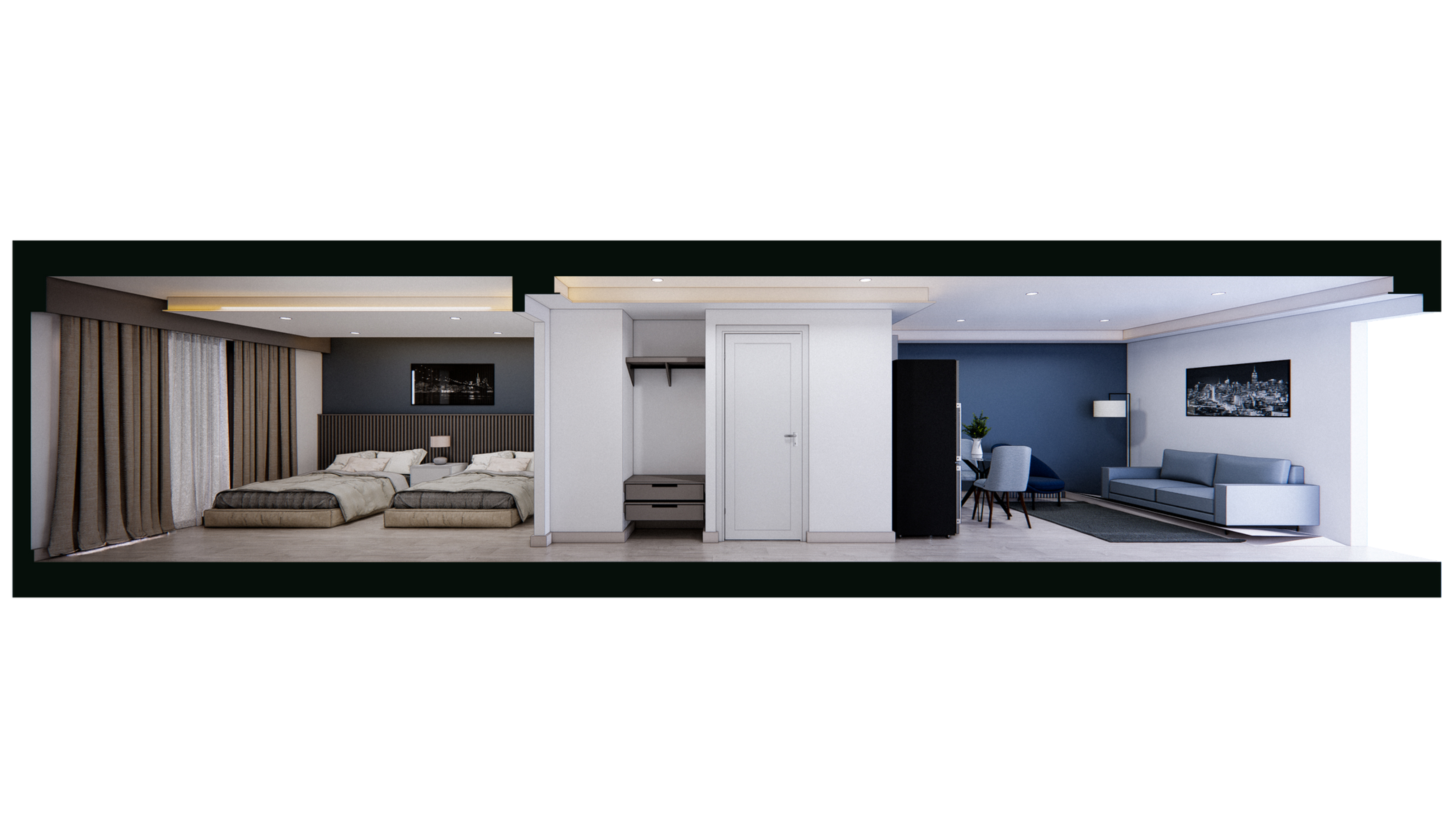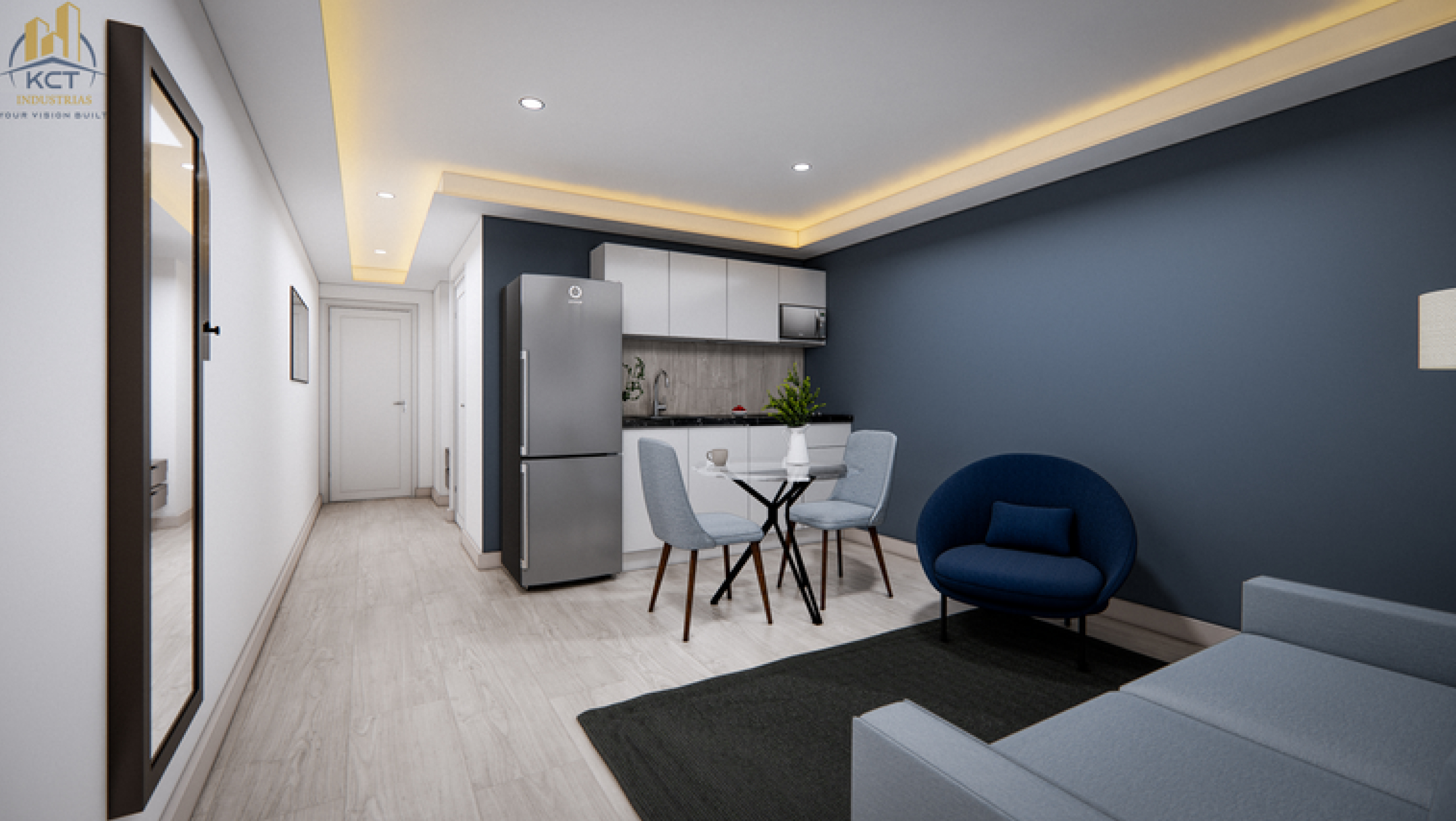 - Sala: Un espacio acogedor con un sofá modular y una mesa auxiliar.